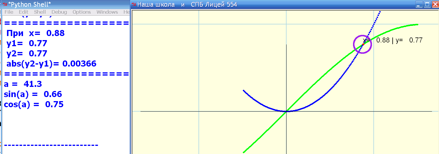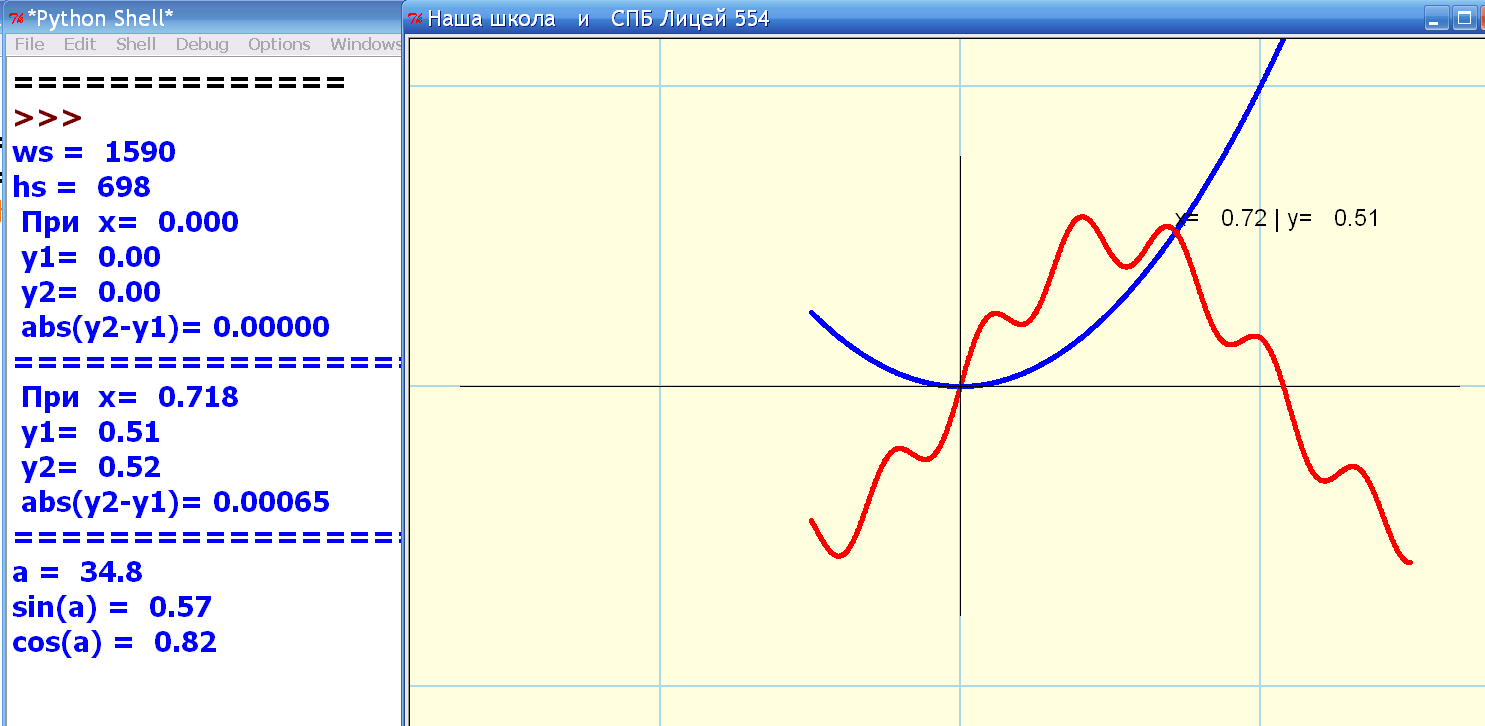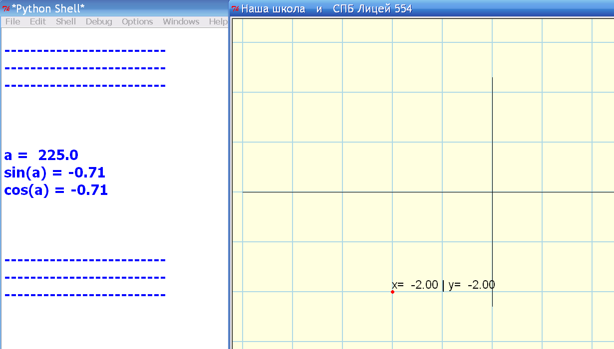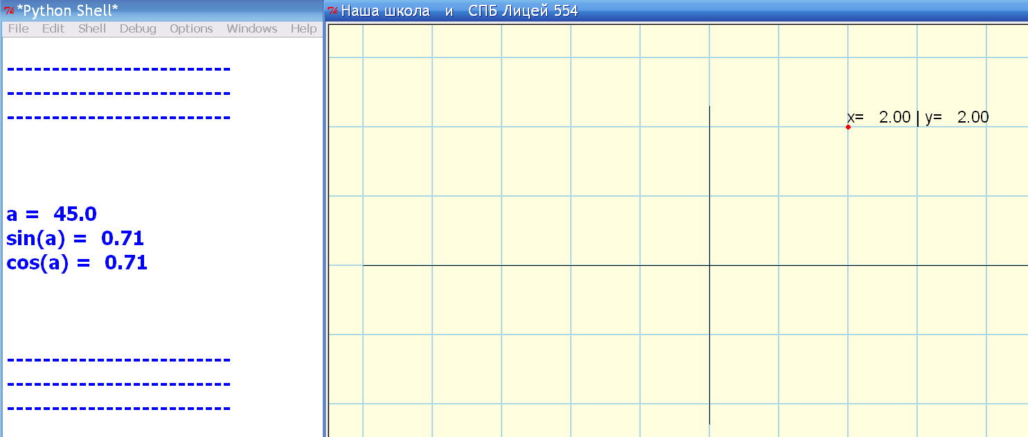 Скачиваем программу и модуль и сохраняем в одну папку. Запускаем программу. щелкаем лкм в любом месте координатной сетки и видим на экране координаты этой точки. Сдвигаем вправо левую рамку (чтобы увидеть окно idle) и видим значение угла и его синуса и косинуса.