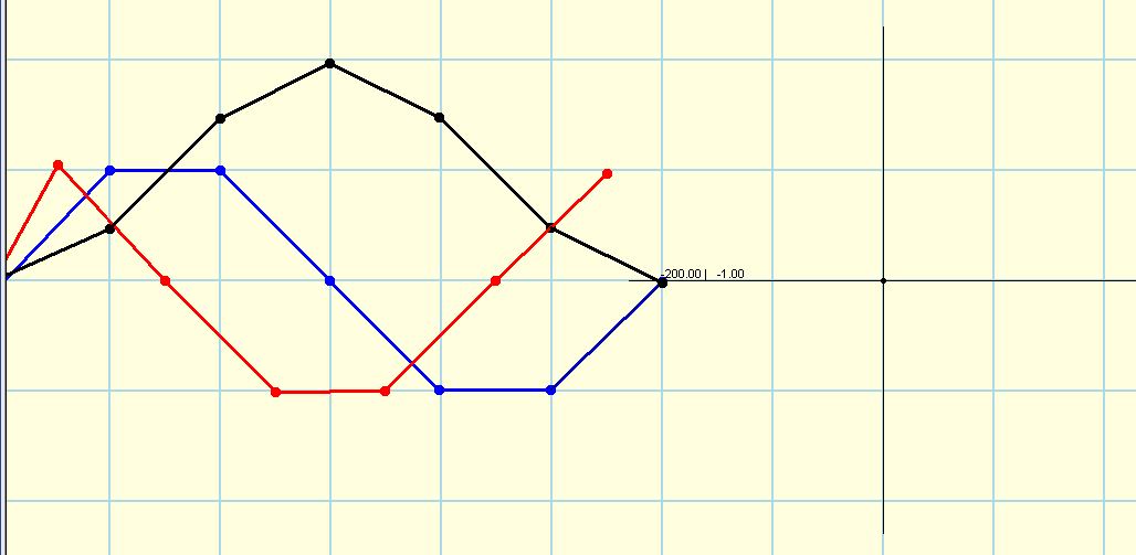 Проверка точности интегрирования. Строим график основной функции (синии точки и линии) так, чтобы сверху и снизу оси абсцисс была одинаковая площадь. Интегральная кривая(черная) должна иметь нулевую ординату в конце построения.