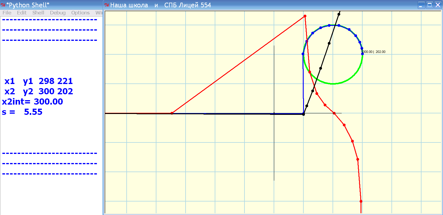 Программы start_... .py и модуль L554 созданы учителями и старшекласниками Лицея №554 Санкт-Петербурга для обеспечения соответствия вида графических построений на экране компьютера с видом их в тетради. Причем масштаб можно задать таким(например, указав в операторе mset=300), что клетка (соответствующая 1 ед) будет занимать половину экрана ( это бывает необходимо для исследования графиков функций в интервале (0-1). При щелчке в любой точке экрана получаем координаты этой точки в принятом масштабе, которые можно использовать в очередном операторе (команде). Добавлены три новых (по синтаксису) оператора: точка, линия, окружность, которые используют "тетрадные" координаты - без всяких преобразований.